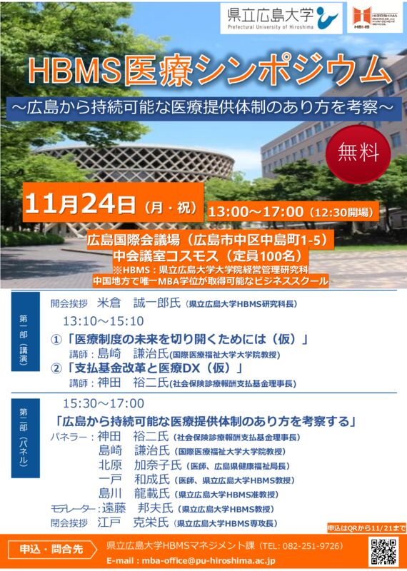 この度、『広島から持続可能な医療提供体制のあり方を考察する』をテーマに、長年医療政策の場に携わった実務家や研究者の方々をお招きして、「HBMS医療シンポジウム」を開催する運びとなりました。県内で医療提供に従事されている方々に、これからの医療機関経営の一助となるべく、日本及び広島県の医療に関して多様な視点で考察して参ります。